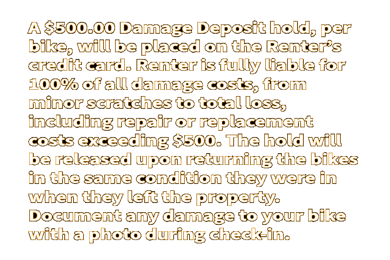 A $500.00 Damage Deposit hold per bike will be placed on the Renter’s credit card. Renter is fully responsible for 100% of all damage costs, from minor scratches to total loss, including repair or replacement costs exceeding $500.